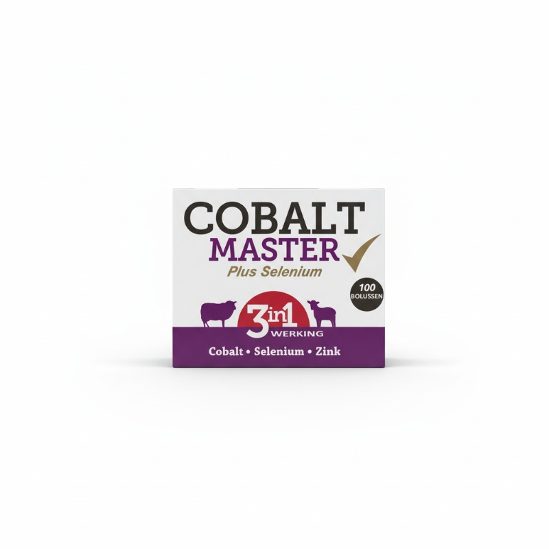 Cobalt Master Plus Selenium (100 st) was een orale bolus voor schapen die geleidelijk cobalt en selenium vrijgaf om tekorten te voorkomen of te behandelen. Cobalt ondersteunt de vorming van vitamine B12 in de pens en groei/conditie van jonge dieren; selenium vermindert risico op spier- en immuunproblemen en ondersteunt vruchtbaarheid. Toediening: éénmalige orale bolus per dier volgens gewicht/levensfase; werking over weken tot maanden. Niet langer leverbaar; bij gebruik altijd dosering en toepassing met dierenarts afstemmen en letten op toxiciteitsrisico’s bij overdosering.