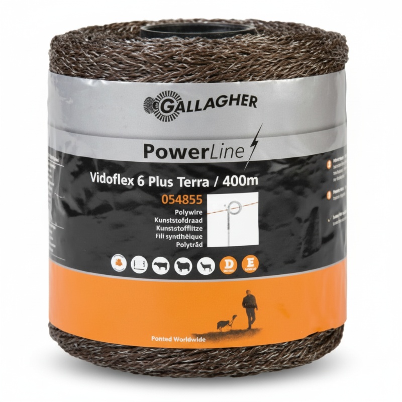 Vidoflex 6 PowerLine kunststofdraad terra, 400 m: polywire van 400 m met zes roestvrijstalen geleiders ingebed in meerdere polyethyleenstrengen, geschikt voor semi-permanente elektrische afrasteringen tot 500 m. Licht, flexibel, weerbestendig en in terra-kleur.